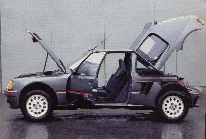 Peugeot 205 Turbo 16, vychází z modelu 205 GTI. Kdo zná tyto automobily tak ví, že T16-tka zdědila pouze tak karosérii. Motor umístěny uprostřed a pohon 4x4. O pohon se staral čtyřválcový šestnáctiventilový motor s kódovým označením XU8T o objemu 1774 ccm s rozvodem DOHC, přímým vstřikováním Bosch K–Jetronic a přeplňovaný turbodmychadlem od firmy Garett. V té době v podstatě málo objemové motory, ve srovnání s dnešními velkými objemy. Motor dosahoval neuvěřitelného výkonu 450-530 koní, všechny zdroje uvádějí odlišné údaje. náprava měla dvojité lichoběžníkové závěsy na všech čtyřech kolech, teleskopické tlumiče a vrtané kotouče s vnitřním chlazením na obou nápravách. To vše sloučené s muší váhou automobilu, která byla u první verze EVO 1 1125 kg a u druhé verze EVO 2 měla váhu ještě sníženou na pouhých 910 kg. Řekl bych, že to je „slušná raketa“ to je 205 T16. Problémem bylo i to, že automobily, které soutěžily v této skupině, musely vycházet ze sériového modelu, sériová výroba měla minimum 200 Ks tohoto modelu, proto muselo být vyrobeno 200 Ks Peugeotu 205 T16 ovšem výkon zde byl omezen na 200 koní. Délka vozu byla 3825 mm a rozvor náprav byl 1674 mm.